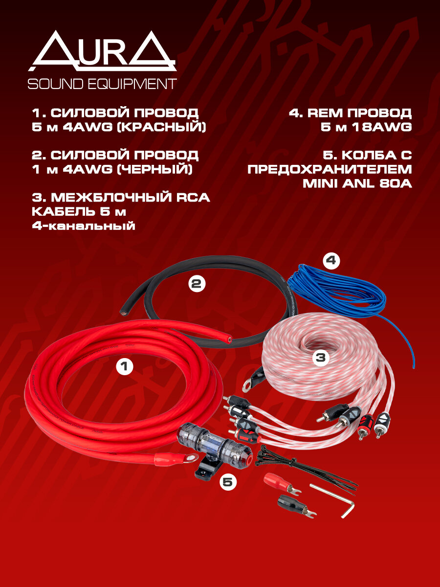 | Комплектация | силовой кабель 8AWG (8мм2) красный - 5 метров, силовой кабель 8AWG (8мм2) черный -1 метр, колба MiniANL + предохранитель 60A, RCA-кабель: 5 метров, 4 канала, витая пара (RCA-A154 MkII), акустический кабель 16AWG (2×1,5мм2) -15 метров, провод «remote» 18AWG (0.75мм2) синий -5 метров, клемма кольцевая для силового кабеля сечением 8AWG (8мм2): 2 шт., клемма U-образная для силового кабеля сечением 8AWG (8мм2): 2 шт., шестигранник, стяжки -10шт. |