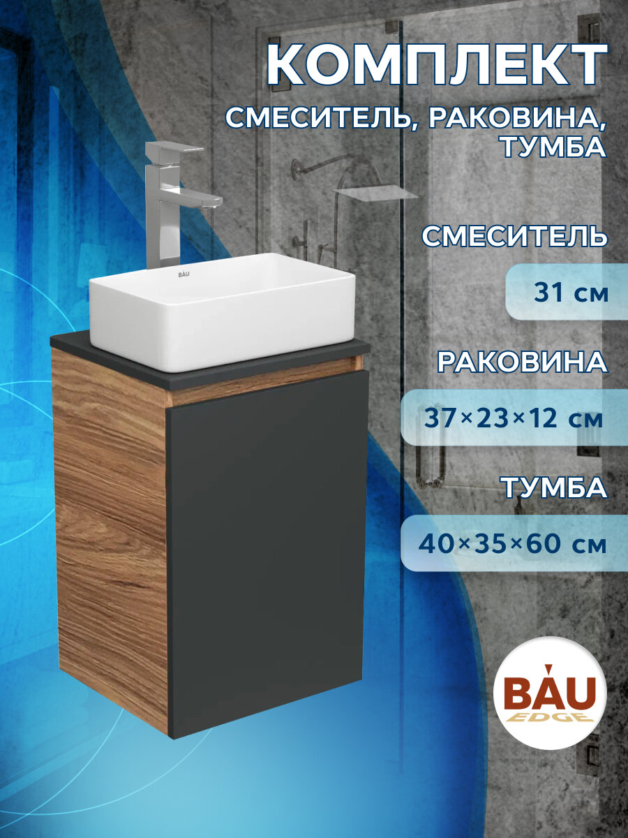 Комплект для ванной, 3 предмета (тумба Bau Dream 40, графит + раковина санфаянс накладная BAU Hotel mini 37х23, смеситель высокий Hotel Still): сравнение цен, характеристики, фото, актуальное наличие и цены.