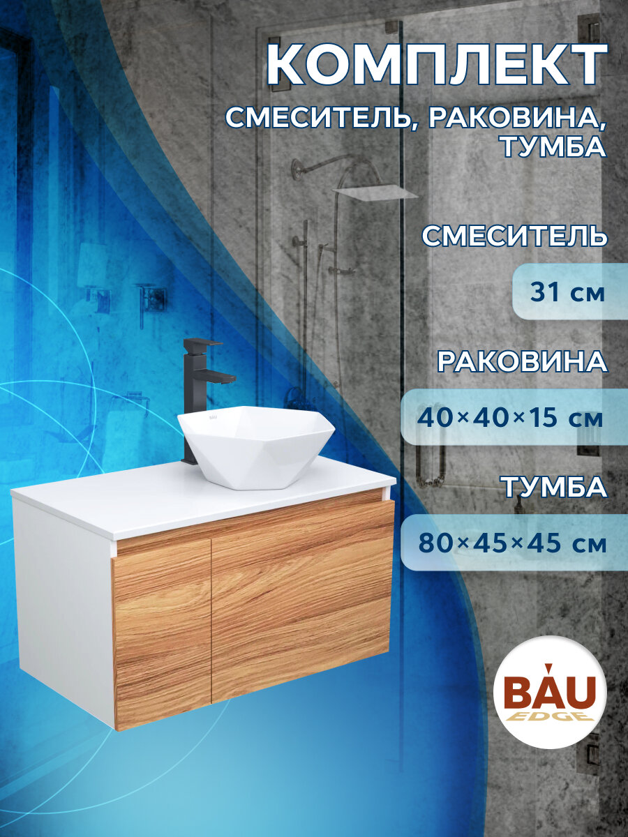 Купить Комплект для ванной, 3 предмета (тумба Bau Dream Blackwood 80 + раковина на столешницу BAU Crystal 40х40, белая, смеситель высокий Hotel Black) с доставкой по всей России. Комплект для ванной, 3 предмета (тумба Bau Dream Blackwood 80 + раковина на столешницу BAU Crystal 40х40, белая, смеситель высокий Hotel Black): сравнение цен, характеристики, фото, актуальное наличие и цены.