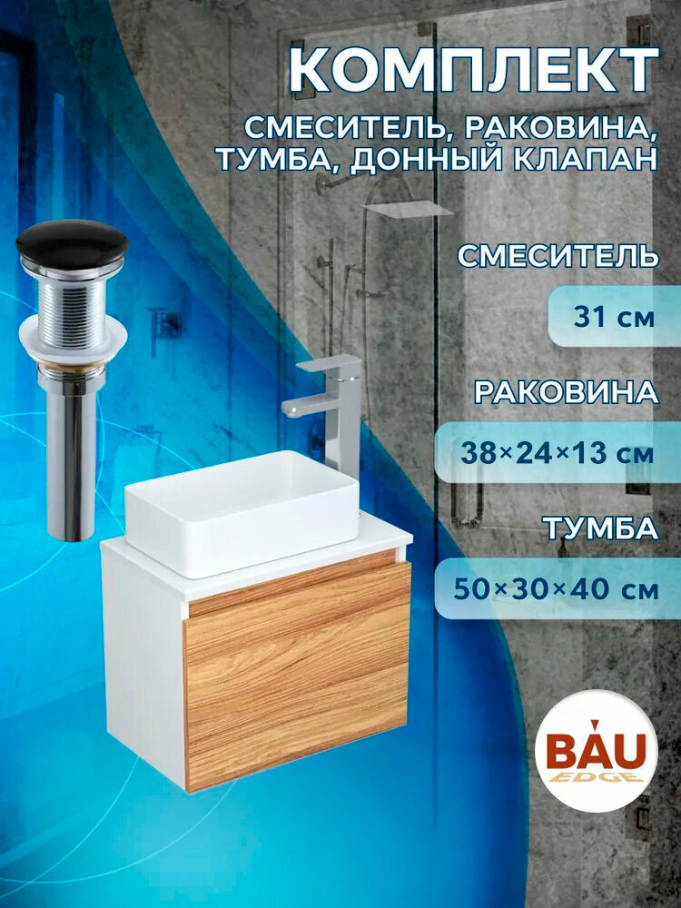 Купить Комплект для ванной, 4 предмета (тумба Bau Dream 50 + раковина BAU 38х24, белая + смеситель Hotel Still, выпуск клик-клак, черный) с доставкой по всей России.
