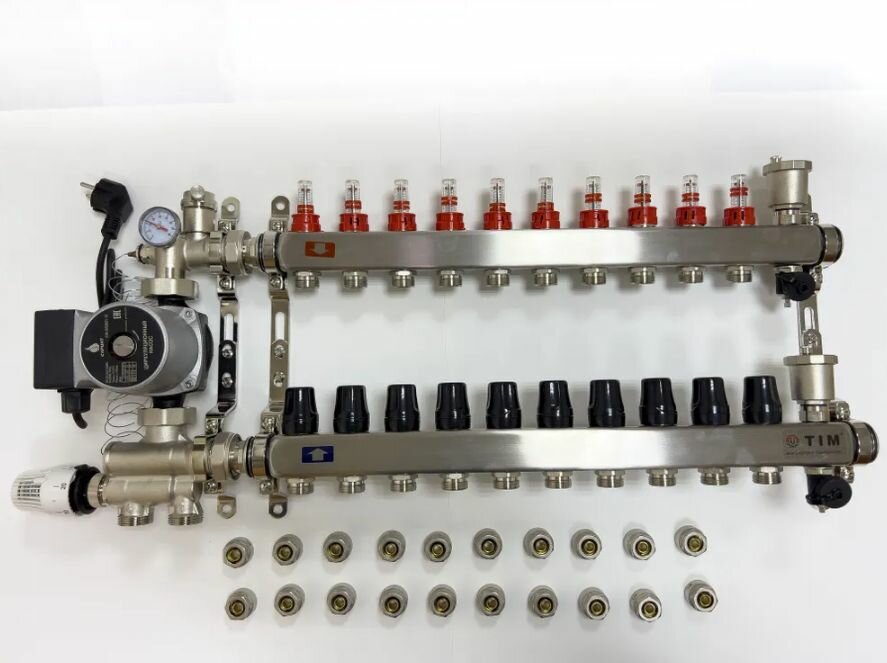 Используется в системах отопления с принудительной циркуляцией. Магистраль возможно подключить как с левой, так и с правой стороны. При этом крепление приспособлено таким образом, чтоб гребенку можно было разместить как в монтажном шкафу, так и прямо на стене. Конструкция коллекторной пары составлена так чтоб легко можно было промыть оба контура: прямого и обратного контура за счет наличия сливных кранов. Гребенка содержит автоматические воздухоотводчики, расположенные на обоих коллекторах и служат для спуска воздуха, который может образоваться во время заполнения системы или ее эксплуатации. Область применения KCS5010 Коллекторные группы из нержавеющей стали распределяют теплоноситель по контурам теплого водяного пола. Лучше всего снабдить гребенку торцевыми шаровыми кранами, которые дадут возможность отсечь магистраль при проведении технического обслуживания или при протекании. Ручные регуляторы на обратке допускается оснащать термоэлектрическими приводами, подключенными к комнатным термостатам, что позволит изменять обогрев на основании настроек температуры воздуха в помещении. Рекомендуется использовать это оборудование совместно со смесительными узлами для понижения температуры отопления до величин, предназначенных для теплых водяных полов.