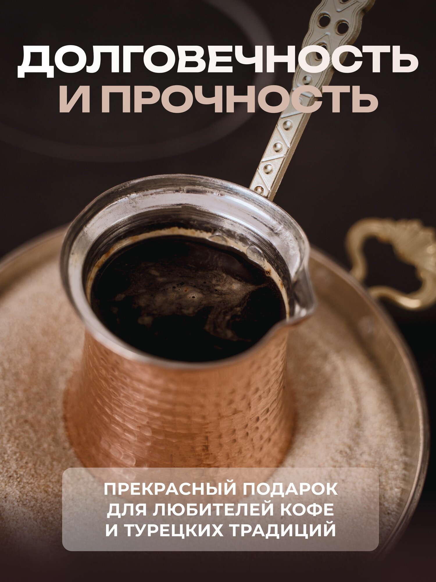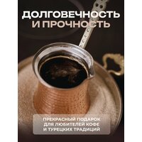 Турки изготовлены из меди, которая обладает равномерной теплопроводностью, что идеально подходит для варки этого напитка. Для предохранения меди от окисления внутреннее покрытие выполнено из пищевого олова. Мелкий кварцевый песок нагревается равномерно и быстро.