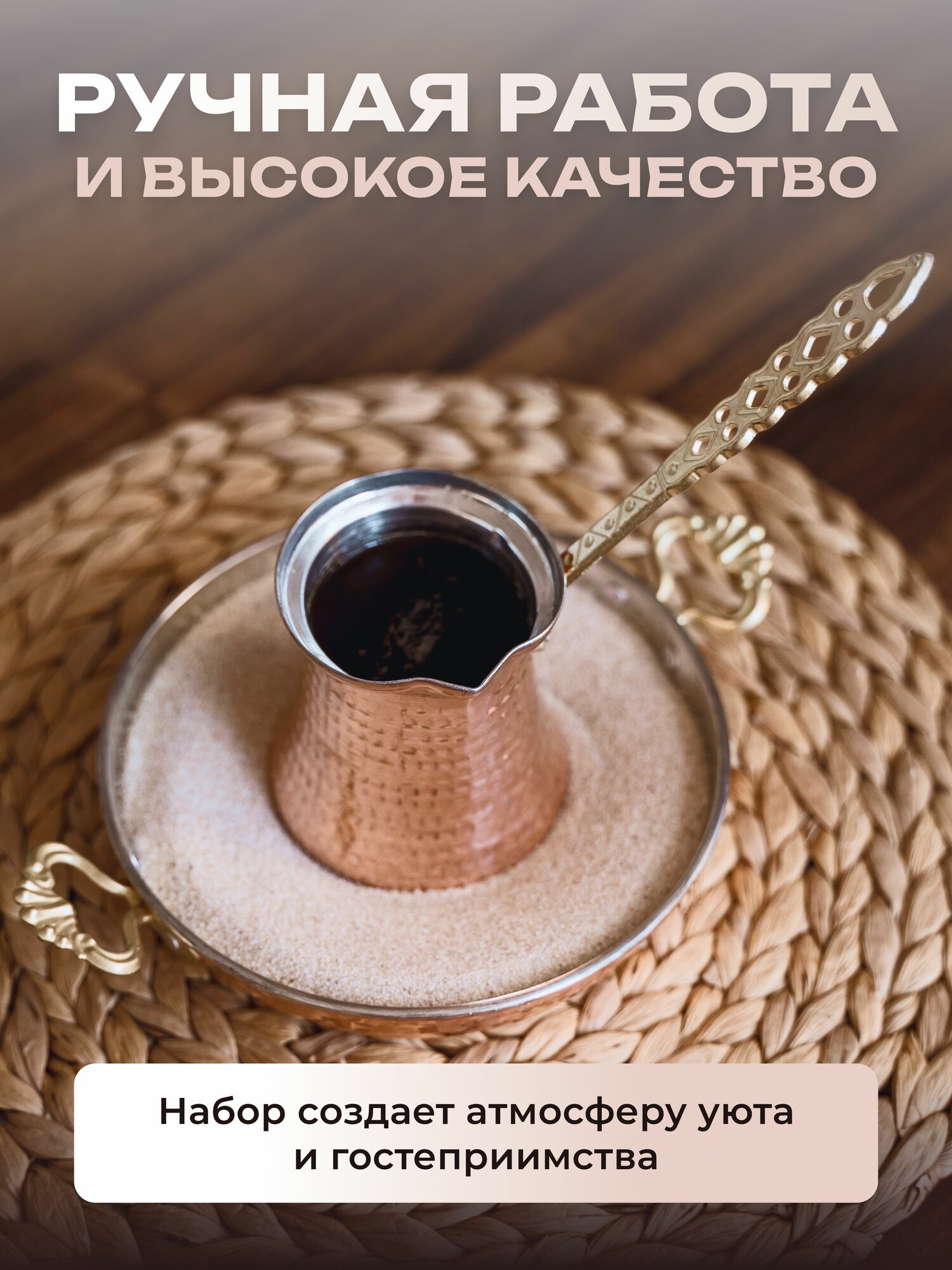 С помощью этого набора вы сможете сварить кофе по-восточному на песке. Считается, что напиток, приготовленный таким образом, позволяет полностью раскрыться кофейному вкусу и аромату.