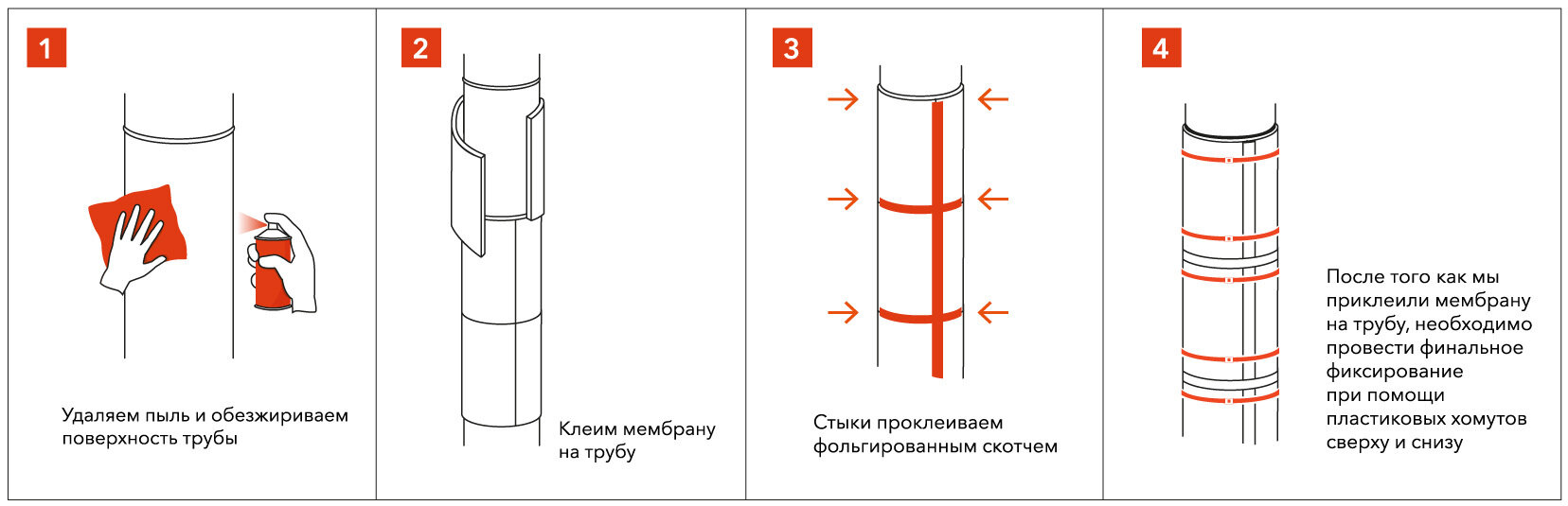Рекомендации по монтажу: 1. Удалить пыль и обезжирить поверхность 2. Наклеить мембрану на трубу стык в стык 3. Стыки проклеить фольгированным скотчем 4. Дополнительно зафиксировать мембрану пластиковыми хомутами сверху и снизу