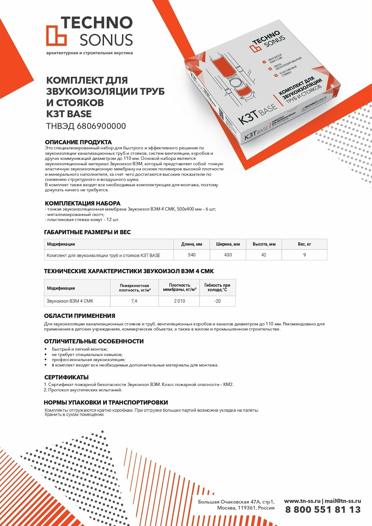 Комплект звукоизоляции для труб Base от компании ТехноСонус – это удобный набор специально подобранных материалов и комплектующих, с помощью которых можно быстро и эффективно изолировать канализационные трубы, стояки, вентиляционные трубы, короба и другую трубную коммуникацию. Комплект рассчитан на трубу длинной до 3х метров диаметром 110 мм. В комплект входит: - звукоизоляционная самоклеящаяся мембрана толщиной 4 мм размером 500х400 мм 6 шт, - набор стяжек, - металлизированный скотч. Область применения: для звукоизоляции канализационных труб, стояков, венткоробов в жилых квартирах, гостиницах, офисных и прочих помещениях. Снижает распространение воздушного и структурного шума, проникаемых в помещения через тонкие, недостаточно изолированные стенки труб и коробов. Преимущества: - быстрый и легкий монтаж; - не требует специальных навыков; - профессиональная звукоизоляция; - в комплект входят все необходимые дополнительные материалы для монтажа.