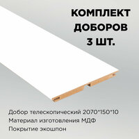 Комплект доборов - 3 шт. Размер :2070х150х10. Конструкция телескоп. Для установки одной стандартной двери требуется 3 добора. Добор необходим, если стенка проёма шире толщины дверной коробки. Выполняет защитную и эстетическую функции. Материал изготовления МДФ, покрытие экошпон.
