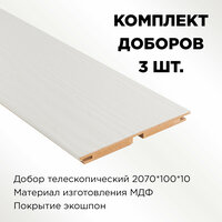 Комплект доборов - 3 шт. Размер :2070х100х10. Конструкция телескоп. Для установки одной стандартной двери требуется 3 добора. Добор необходим, если стенка проёма шире толщины дверной коробки. Выполняет защитную и эстетическую функции. Материал изготовления МДФ, покрытие экошпон.