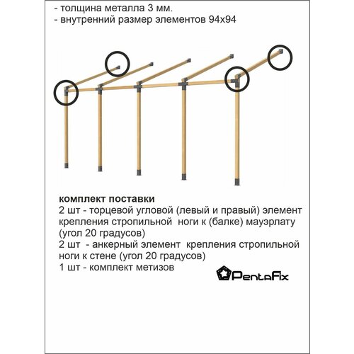 В комплект поставки входят два элемента с толщиной стенки 3мм (1 - анкерная наклонная опора, 1 - угловой элемент на 4 выхода бруса) окрашенные порошковой краской черного цвета с необходимым количеством саморезов толщиной 8мм. и пластиковыми колпачками.