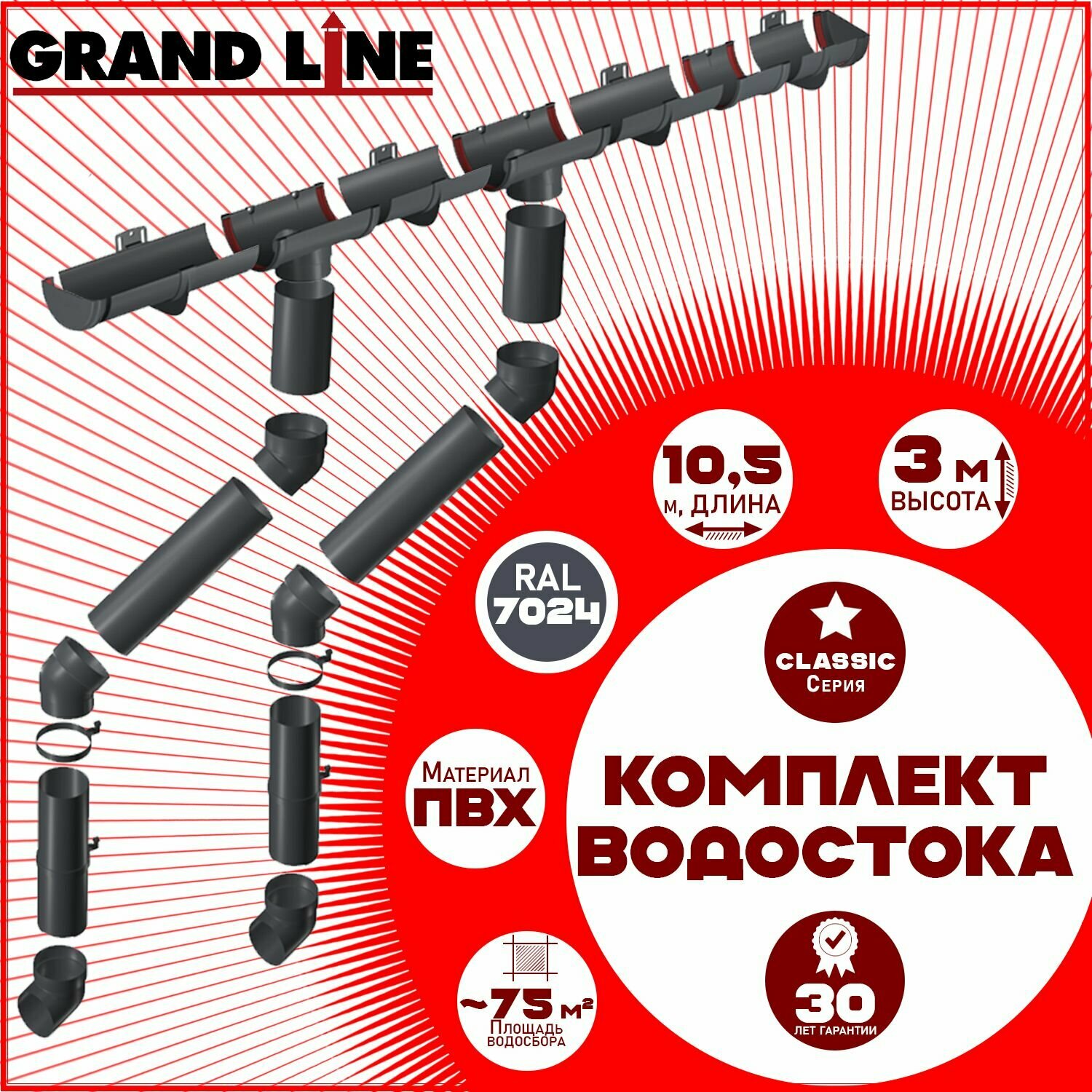 Купить Комплект элементов водостока Grand Line на 10,5 м карниза (120мм/90мм) графит RAL 7024, водосточная система для крыши пластик Гранд Лайн ( серый ) ПВХ с доставкой по всей России.
