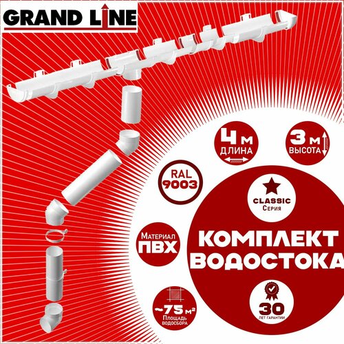 Комплект элементов водостока Grand Line на 4 м карниза по 1 метру (120мм/90мм) белый, водосточная система для крыши пластик Гранд Лайн ( RAL 9003 пломбир ) комплект ПВХ: сравнение цен, характеристики, фото, актуальное наличие и цены.