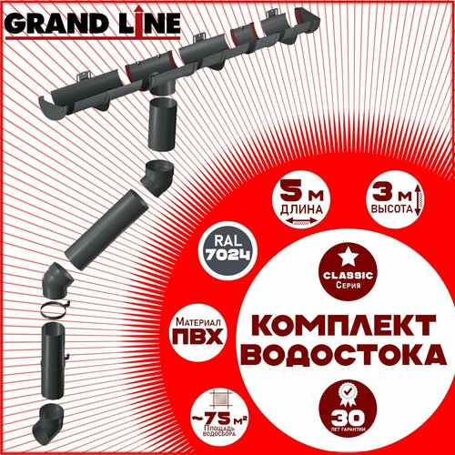 Комплект элементов водостока Grand Line на 5 м карниза по 1 метру (120мм/90мм) графит RAL 7024, водосточная система для крыши пластик Гранд Лайн ( серый ) комплект ПВХ: сравнение цен, характеристики, фото, актуальное наличие и цены.