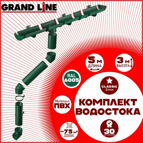 Комплект элементов водостока Grand Line на 5 м карниза по 1 метру (120мм/90мм) зеленый, водосточная система для крыши пластик Гранд Лайн ( RAL 6005 мох ) комплект ПВХ: сравнение цен, характеристики, фото, актуальное наличие и цены.