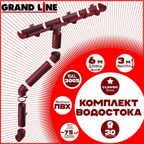 Комплект элементов водостока Grand Line на 6 м карниза по 1 метру (120мм/90мм) вишневый, водосточная система для крыши пластик Гранд Лайн ( RAL 3005 красный) комплект ПВХ: сравнение цен, характеристики, фото, актуальное наличие и цены.