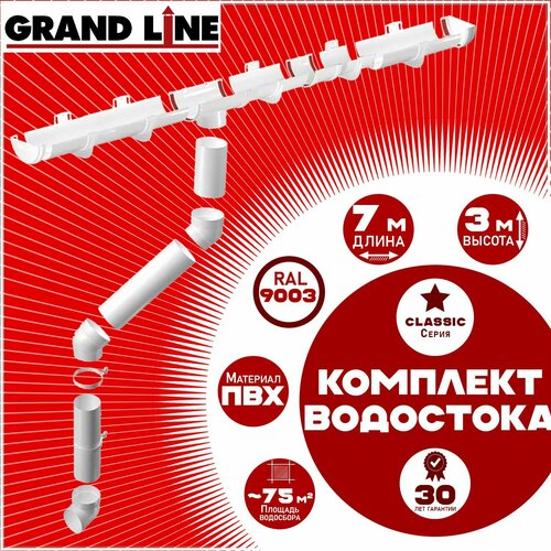 Комплект элементов водостока Grand Line на 7 м карниза по 1 метру (120мм/90мм) белый, водосточная система для крыши пластик Гранд Лайн ( RAL 9003 пломбир ) комплект ПВХ: сравнение цен, характеристики, фото, актуальное наличие и цены.