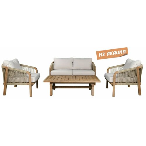 Дизайнерские формы мебели из этой коллекции создадут стильный и узнаваемый облик зоны отдыха на вашей веранде. Ravona - это современная коллекция садовой мебели из акации, выполненная в комбинации натурального веревочного плетения роуп, акации и бежевых подушек. Цвет натуральной твердой древесины представляет собой натуральный цвет с мелкой текстурой, придающий древесине приятный теплый вид. Ravona - это стиль и элегантность на Вашей веранде.