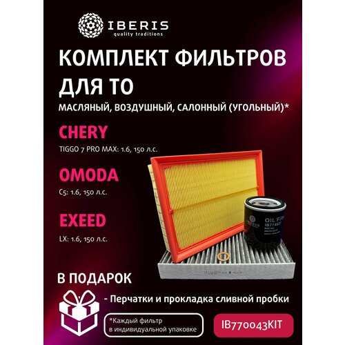 Комплект высококачественных фильтров IBERIS IB770043KIT предназначен для технического обслуживания автомобилей Chery Tiggo 7 PRO MAX, EXEED LX, OMODA C5 с двигателем 1.6 л. и мощностью 150 л. с.