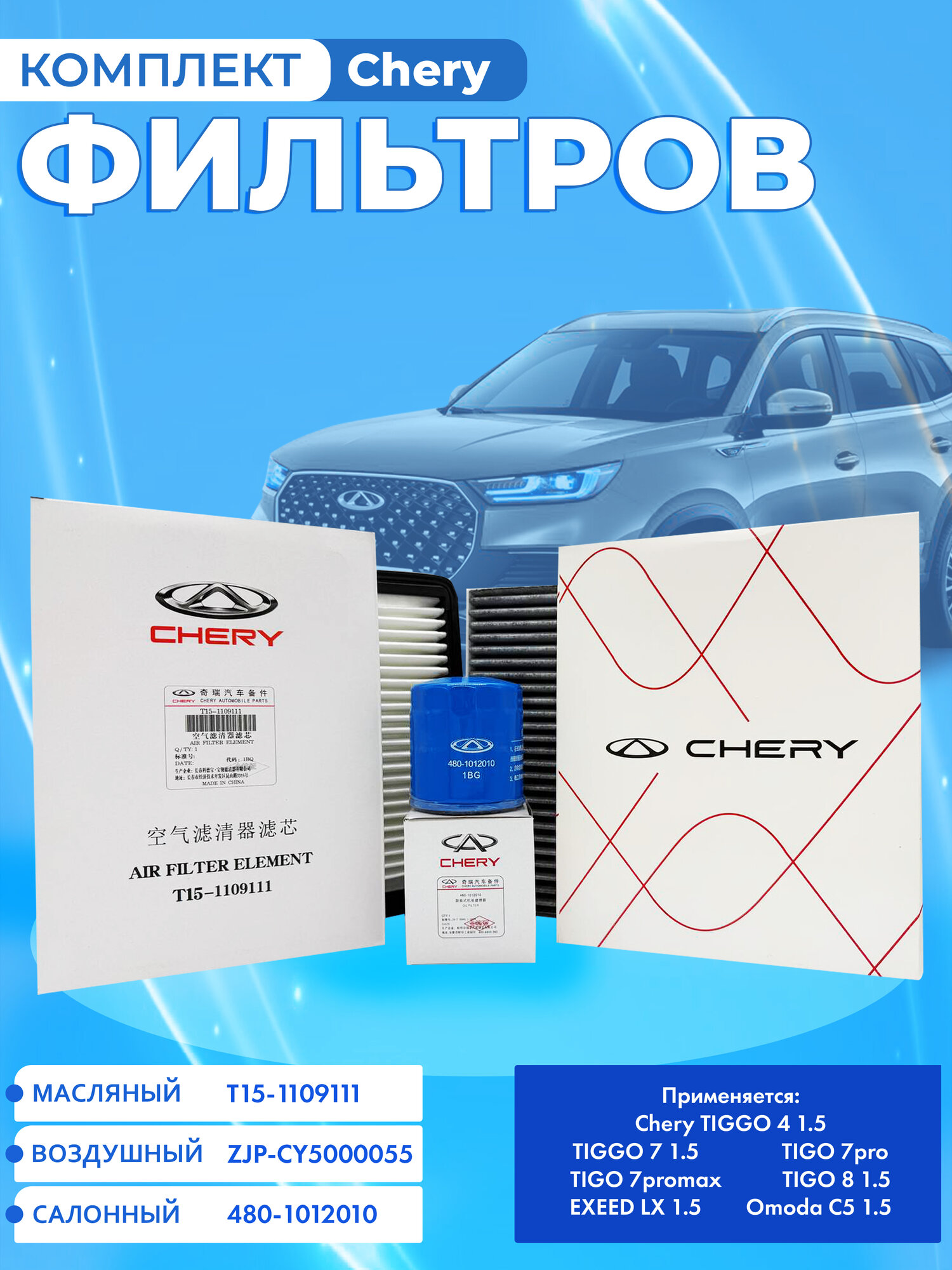 Комплект фильтров для ТО Chery TIGGO 4 1.5, 7 1.5, 7pro, 7promax, 8 1.5, EXEED LX 1.5, Omoda C5 1.5