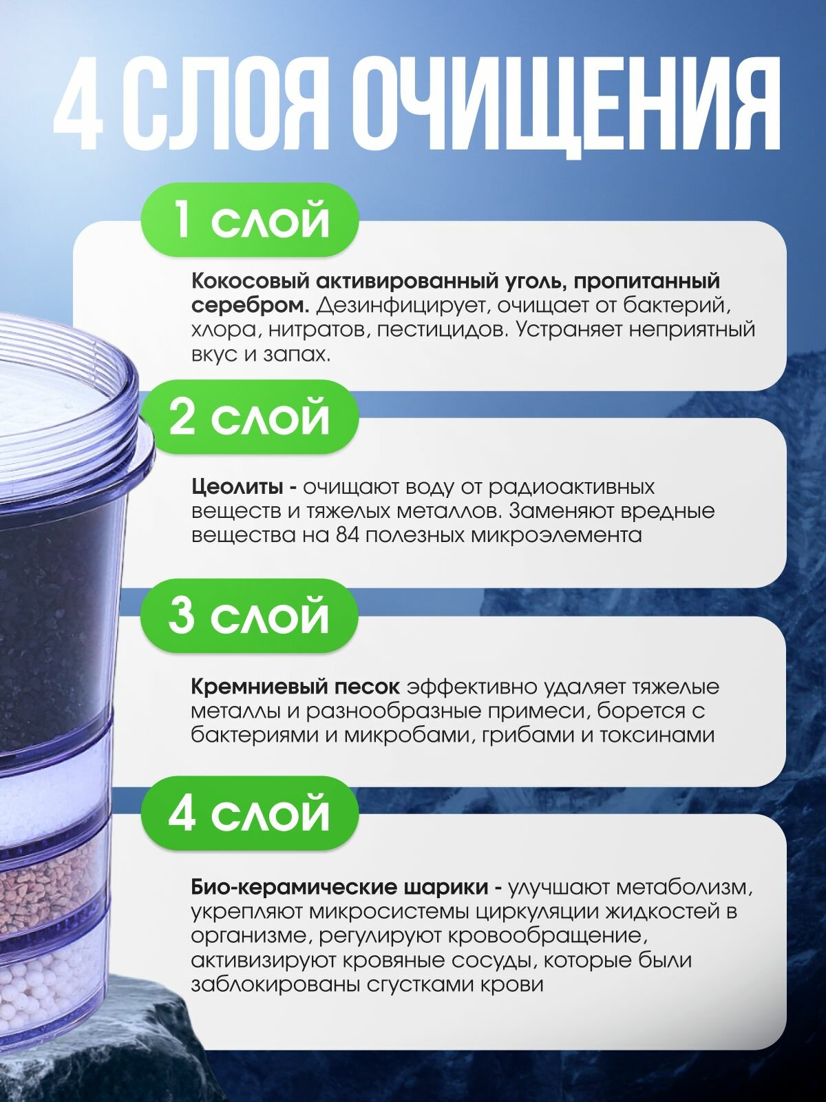 В состав Oсновного фильтра входят активированный уголь, цеолит и минеральный песок.