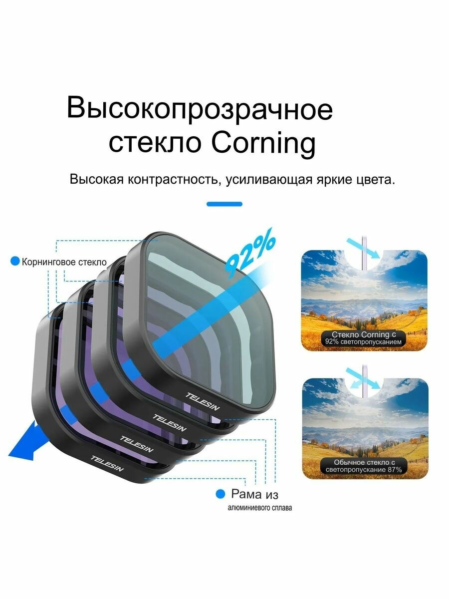Повысьте качество съёмки с помощью профессионального набора светофильтров от TELESIN, специально разработанного для экшн-камеры GoPro Hero 13. Комплект включает три фильтра нейтральной плотности (ND8, ND16, ND32) и один поляризационный фильтр (CPL), обеспечивая широкий спектр возможностей для улучшения качества съёмки в различных условиях.