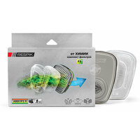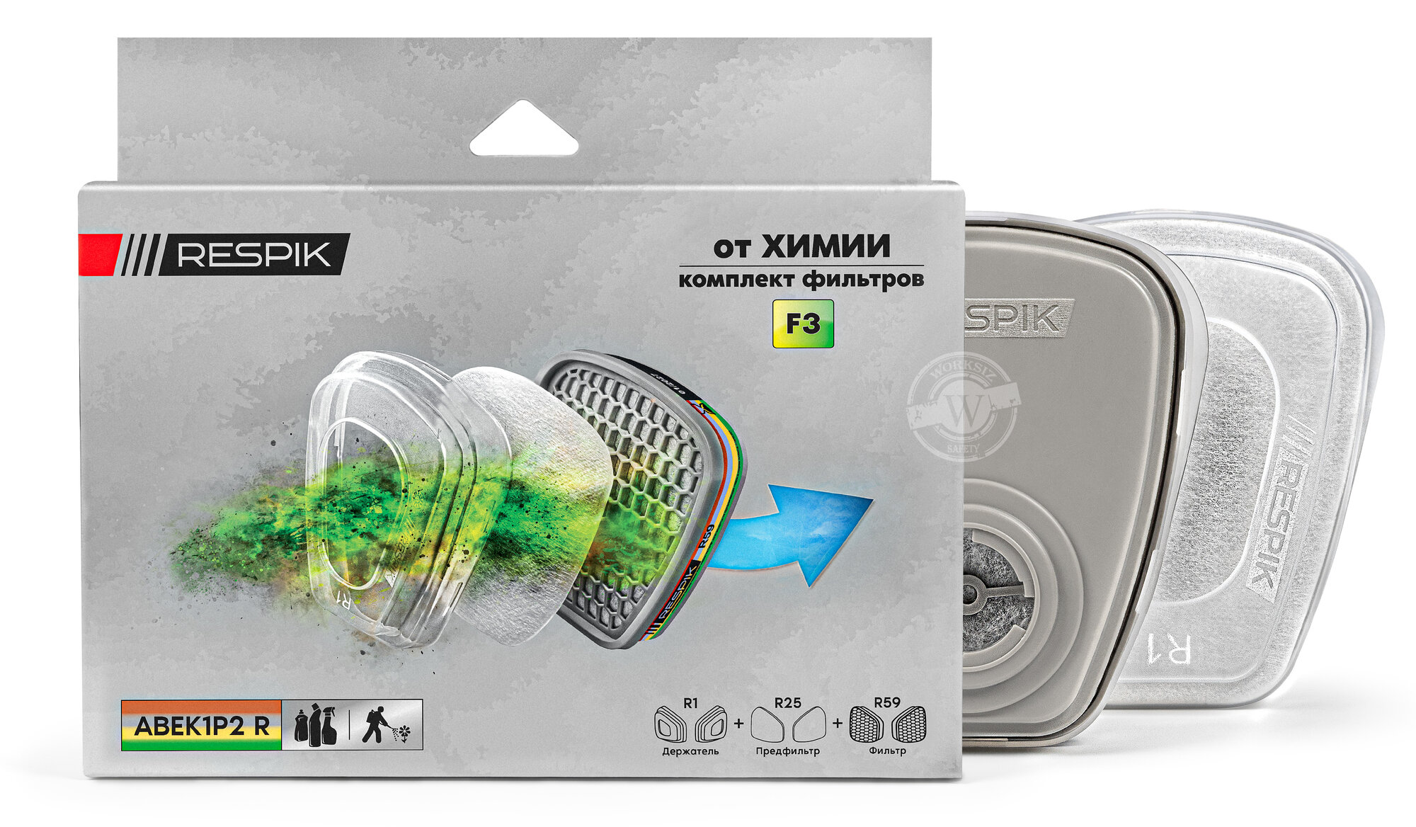 Комплект включает в себя: фильтры RESPIK® R59 (аналогичен 3М 6059) 1 пара, предфильтры RESPIK® R25 (аналогичен 3М 5925) 1 пара и держатели предфильтра RESPIK™ R1 (аналогичен 3М 501) 1 пара.