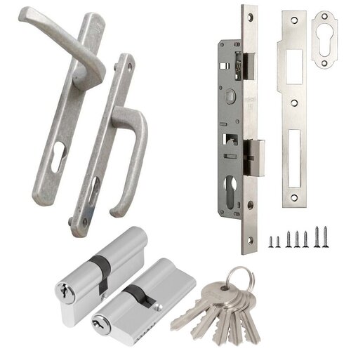 Готовый комплект фурнитуры для установки на калитки, пластиковые или алюминиевые двери. Идеально подходит для установки в профильную трубу, 35/35, 20/40, 40/40, 40/60. Удаление ключевого отверстия 20 мм Межосевое расстояние 85 мм Комплектация: 1) Дверная ручка ЛДМ 7035 неокрашенная - 2 шт. 2) Квадрат 8*8*140 мм - 1 шт. 3) Стяжной винт - 2 шт. 4) Замок 153-20/85 5) Цилиндровый механизм ("личинка") Ajax AX100 70мм ключ-ключ