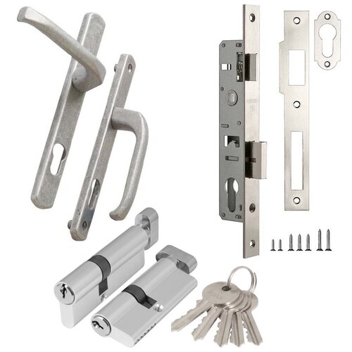 Готовый комплект фурнитуры для установки на калитки, пластиковые или алюминиевые двери. Идеально подходит для установки в профильную трубу, 35/35, 20/40, 40/40, 40/60. Удаление ключевого отверстия 20 мм Межосевое расстояние 85 мм Комплектация: 1) Дверная ручка ЛДМ 7035 неокрашенный - 2 шт. 2) Квадрат 8*8*140 мм - 1 шт. 3) Стяжной винт - 2 шт. 4) Замок 153-20/85 6) Цилиндровый механизм ("личинка") Ajax AX102 70мм ключ-вертушка