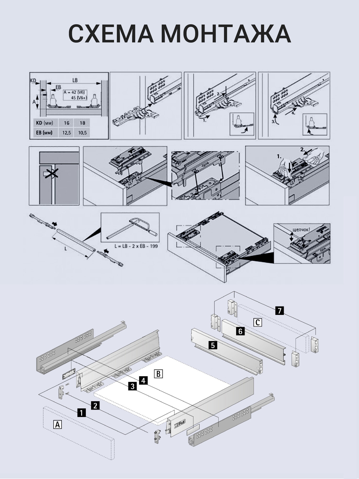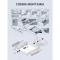 | Подробная комплектация | Боковины ящика (левая и правая); Держатели для задней стенки (левый и правый); Соединители фасада ящика (2 шт.); Заглушки из пластика с логотипом Hettich (2 шт.);Релинги (2 шт.); Крепеж релинга (2 шт.) |