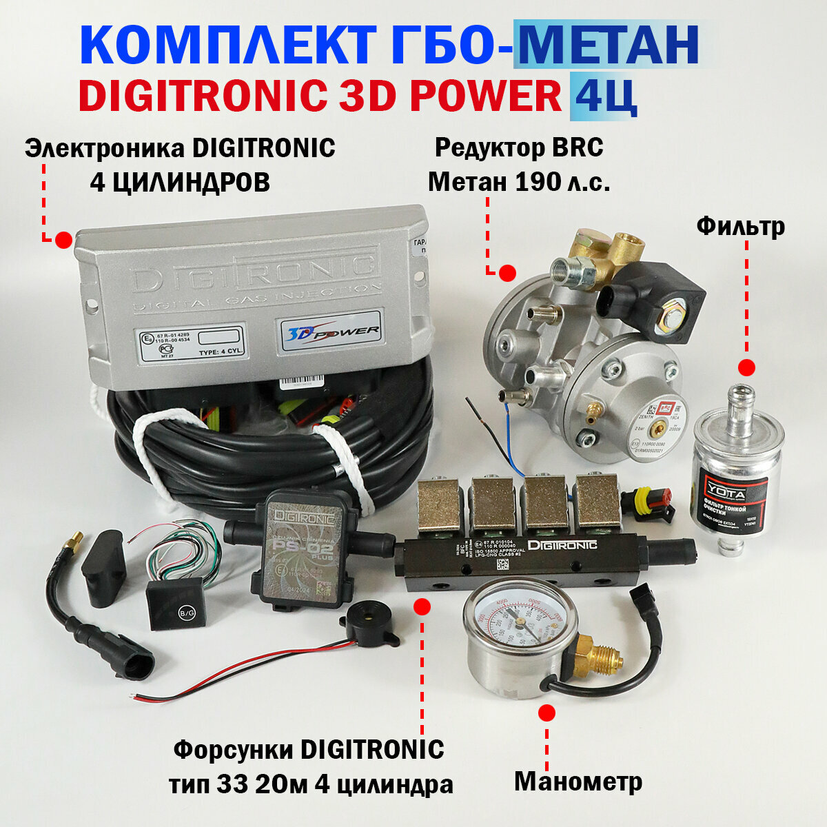 Данный комплект ГБО 4 поколения для 4 цилиндровых двигателей на метане (CNG) состоит из: