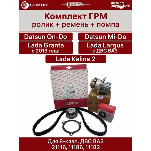 Комплект ГРМ, состоящий из ремня ГРМ от российской компании БРТ, усиленного металлического ролика компании "Автопараллель" и помпы Luzar Turbo от российского производителя Luzar.