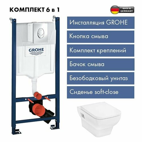 Комплект GROHE Rapid SL Инсталляция для подвесного унитаза, 3 режима, панель смыва, матовый хром 38745001 + Hansgrohe CreekTide Q Унитаз подвесной 540×360, сиденье с микролифтом, безободковый, белый: сравнение цен, характеристики, фото, актуальное наличие и цены.
