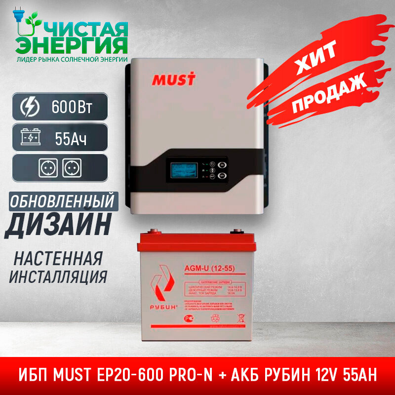 Купить ИБП для котла | Комплект ИБП MUST EP20-600 PRO-N + АКБ рубин 12V 55Ah с доставкой по всей России.