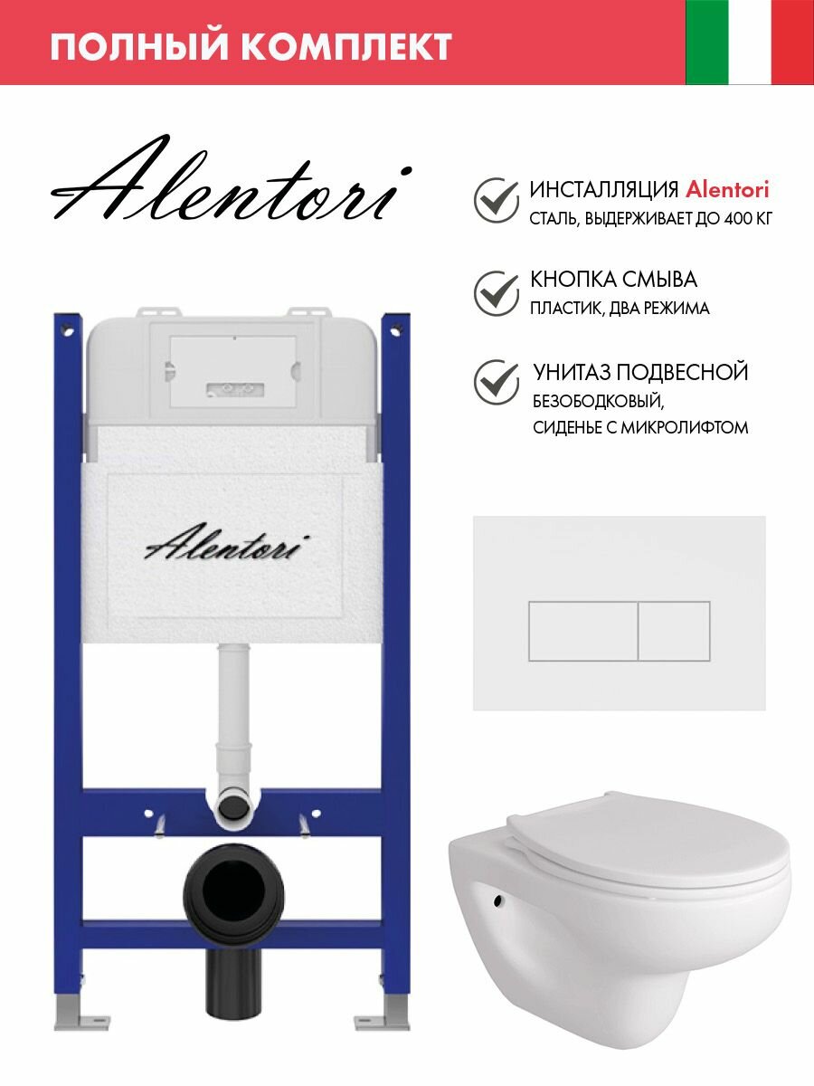 Купить Комплект Инсталляция для унитаза Alentori SISTEMA 50 AL. SIS33T с клавишей Alentori CHIAVE H, белый матовый AL. CHI018WM + Alentori FLUIRE 901 Унитаз безободковый, с микролифтом, белый глян. с доставкой по всей России.