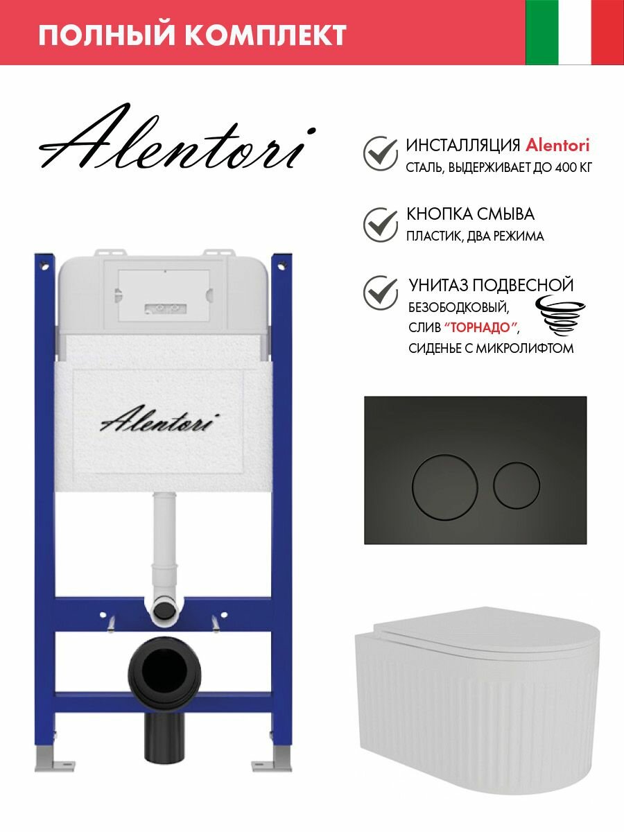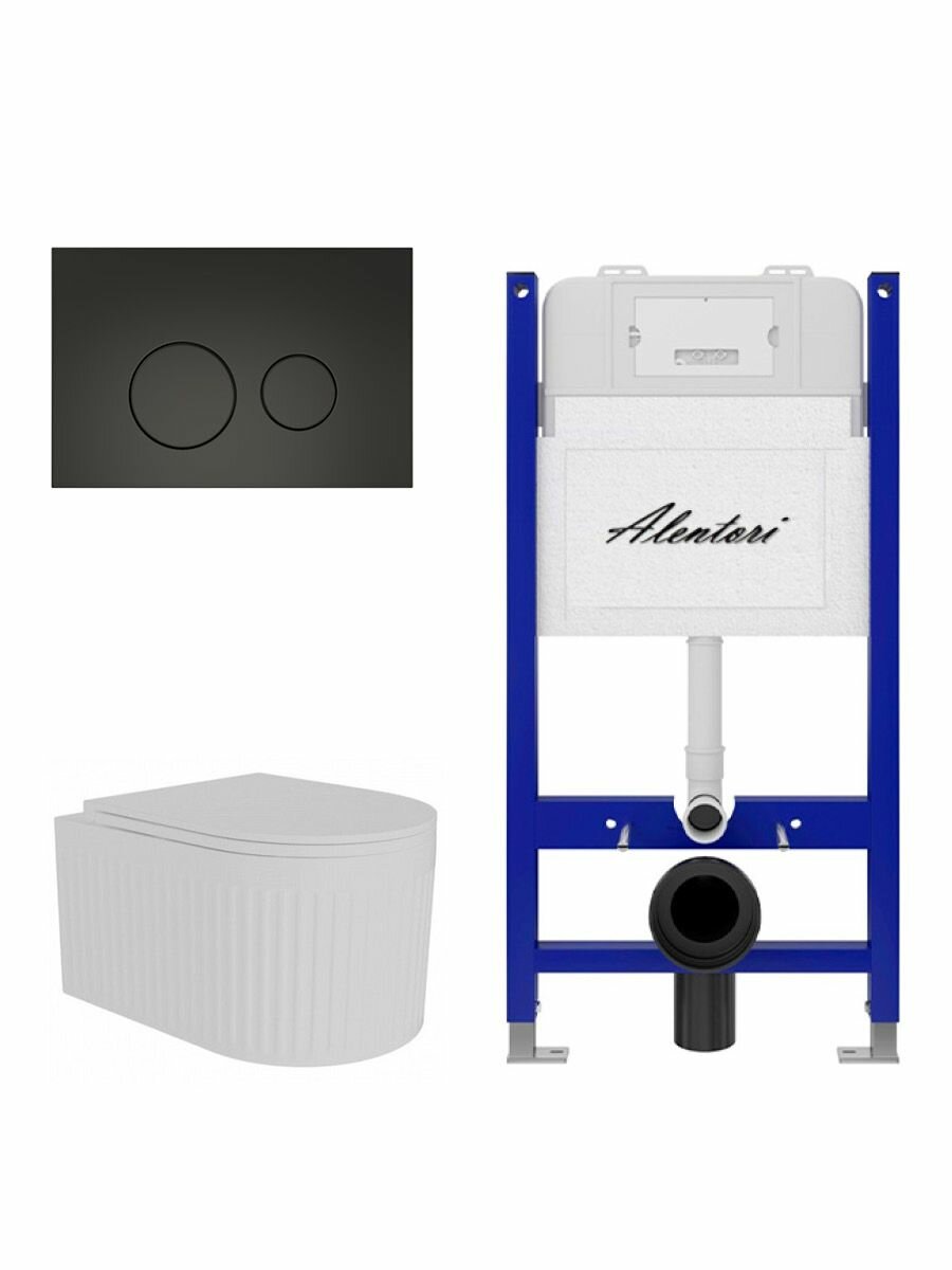 Комплект Инсталляция для унитаза Alentori SISTEMA 50 AL. SIS33T с клавишей Alentori CHIAVE L, черный матовый AL. CHI103BM + Alentori FLUIRE 2101 Vortex Унитаз безободковый, с микролифтом, белый глян.: сравнение цен, характеристики, фото, актуальное наличие и цены.