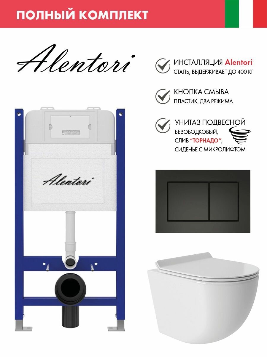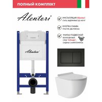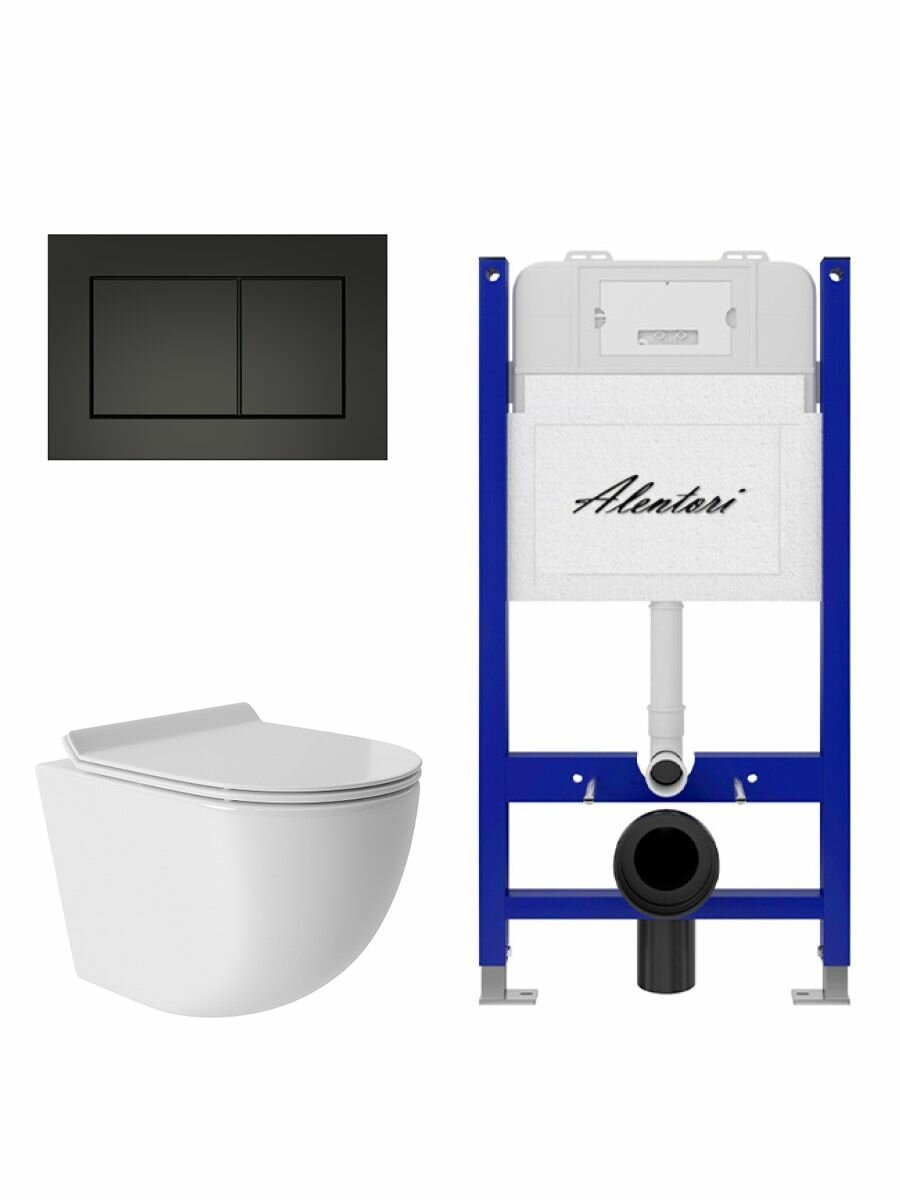 Купить Комплект Инсталляция для унитаза Alentori SISTEMA 50 AL. SIS33T с клавишей смыва Alentori CHIAVE A, черный матовый AL. CHI013BM + Унитаз 480*360 безободковый, Vortex, Soft-Close, белый глянцевый, овал с доставкой по всей России.