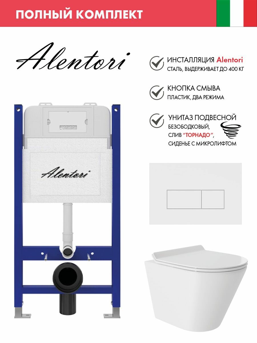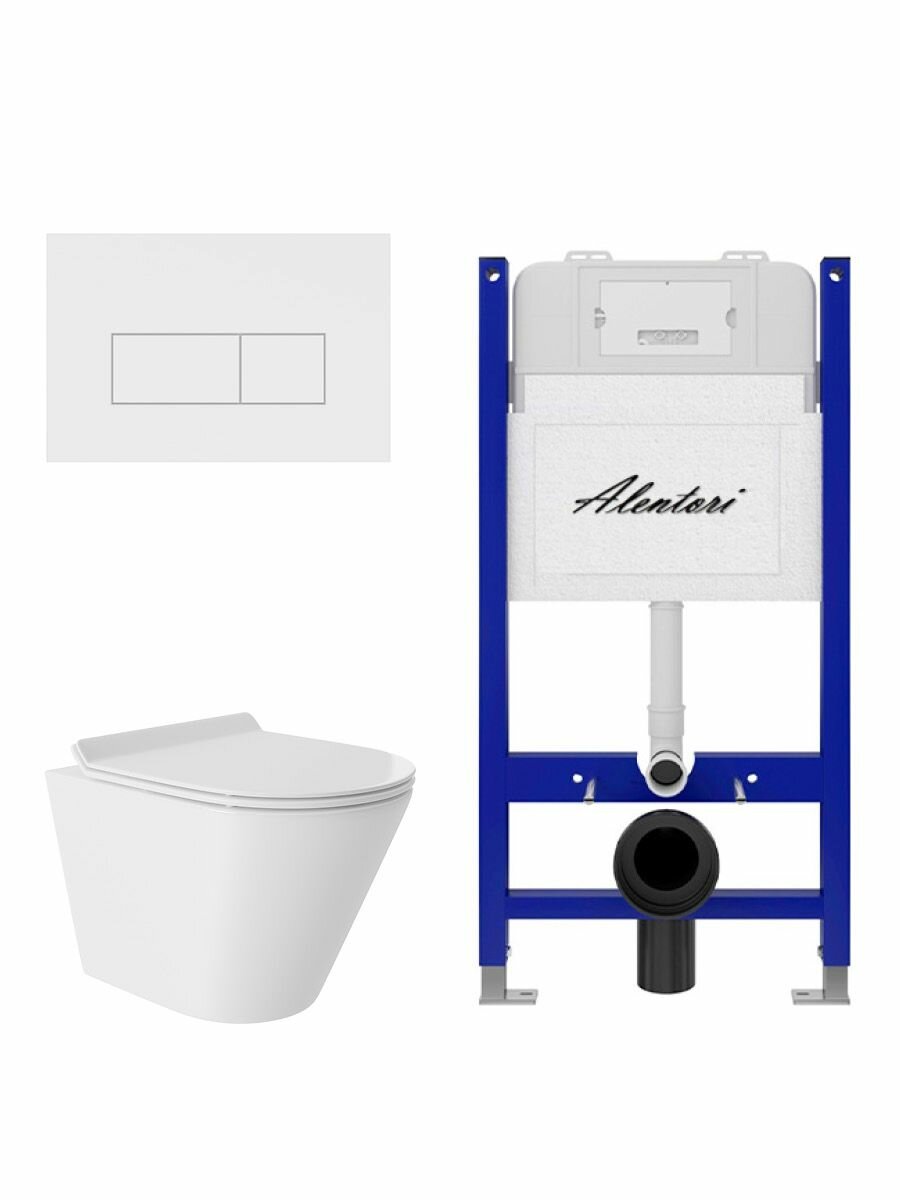 Купить Комплект Инсталляция для унитаза Alentori SISTEMA 50 AL. SIS33T с клавишей смыва Alentori CHIAVE H, белый матовый AL. CHI018WM + Унитаз 480*360 безободковый, Vortex, Soft-Close, белый глянцевый, конус с доставкой по всей России.