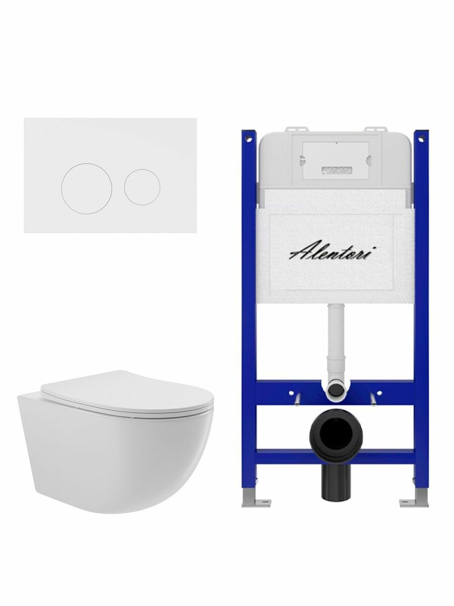Купить Комплект Инсталляция для унитаза Alentori SISTEMA 50 AL. SIS33T с клавишей смыва Alentori CHIAVE L, белый матовый AL. CHI019WM + Унитаз 525*360 безободковый, Soft-Close, белый глянцевый, форма овал с доставкой по всей России.