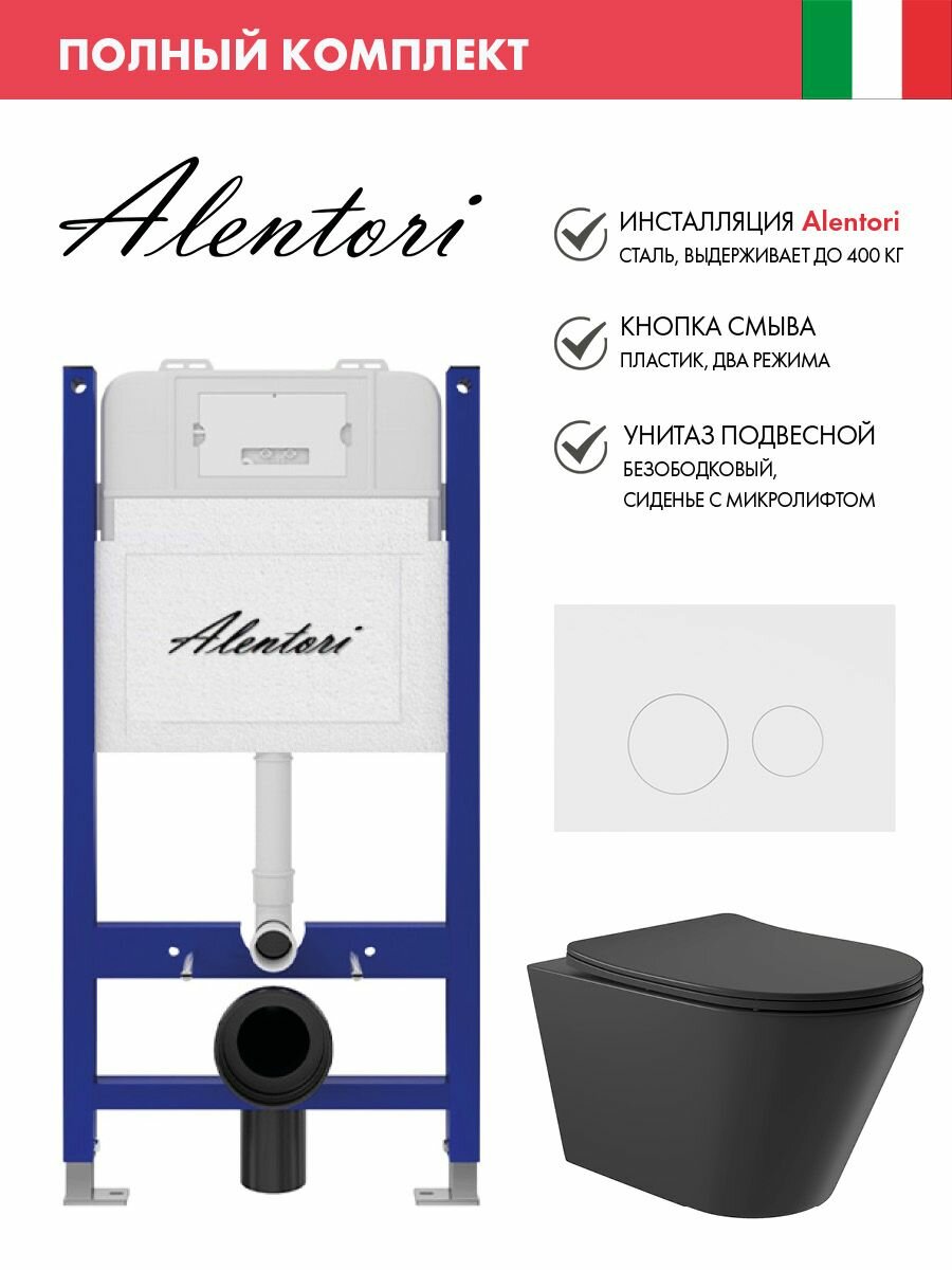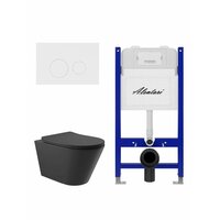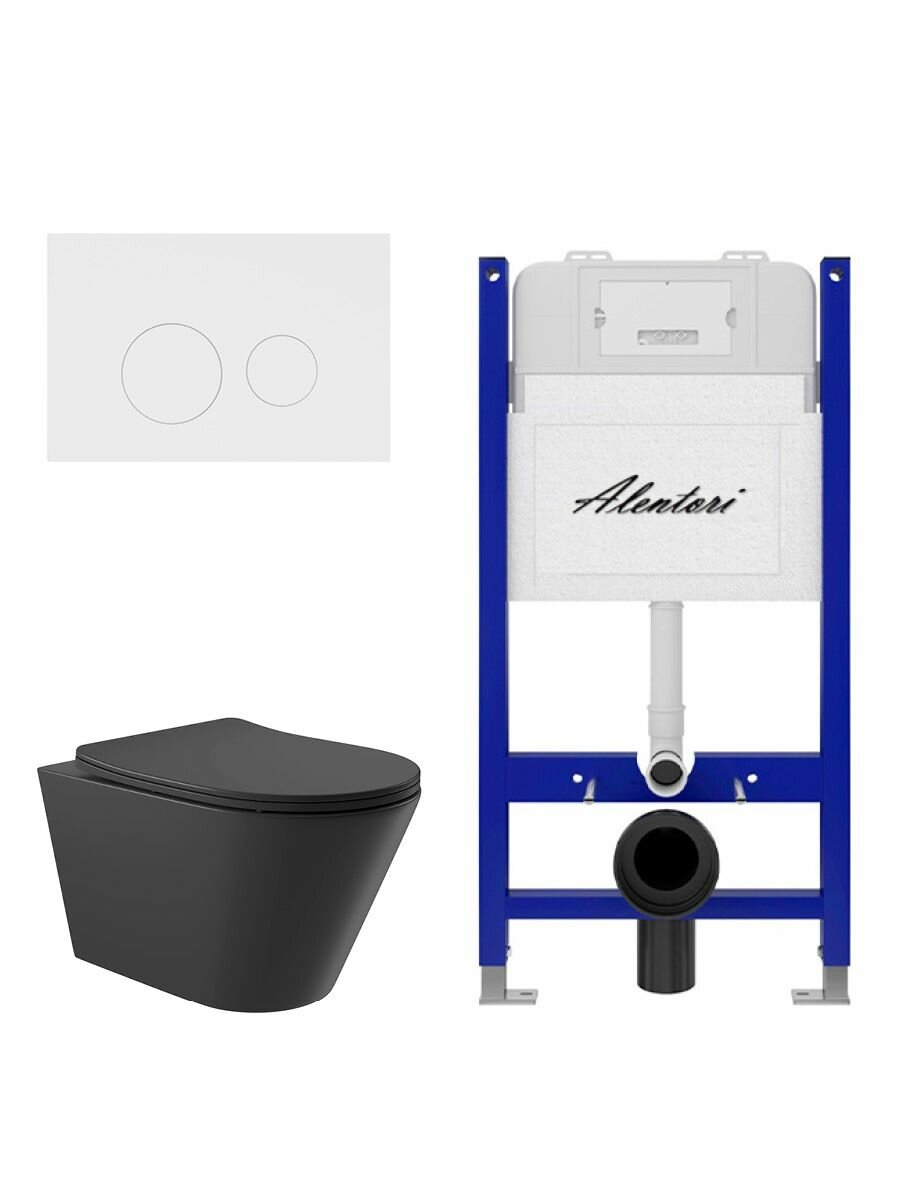 Купить Комплект Инсталляция для унитаза Alentori SISTEMA 50 AL. SIS33T с клавишей смыва Alentori CHIAVE L, белый матовый AL. CHI019WM + Унитаз 525*360 безободковый, Soft-Close, черный матовый, форма конус с доставкой по всей России.