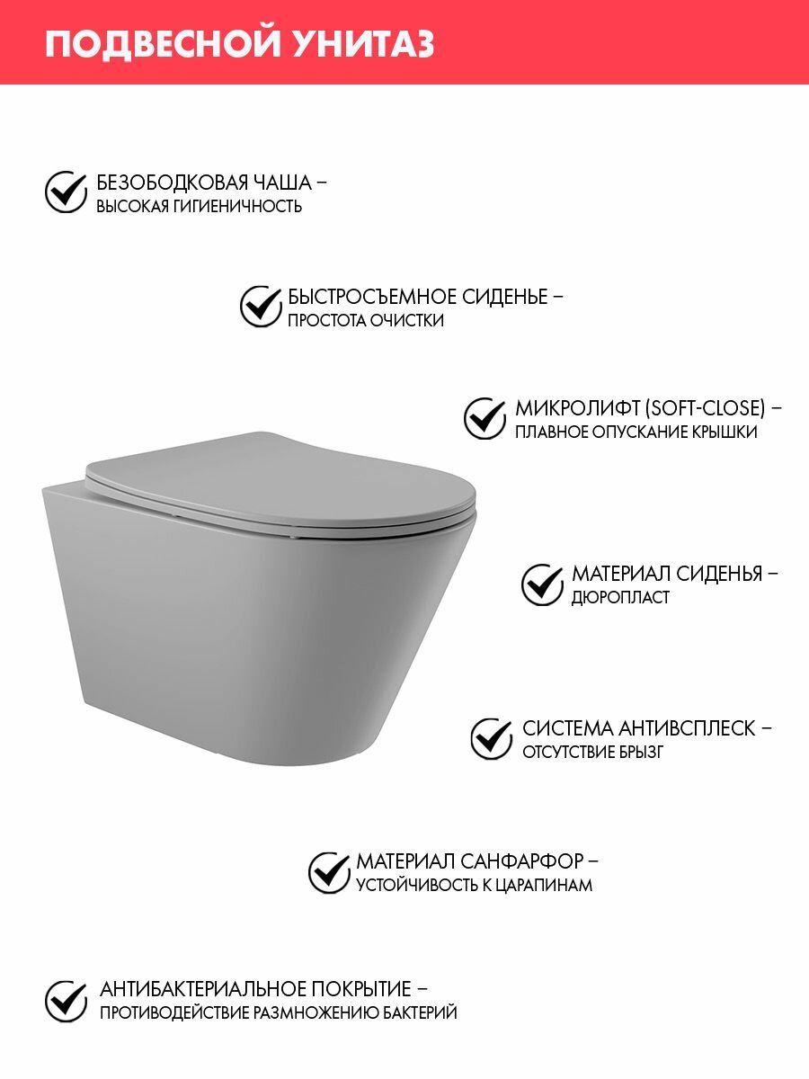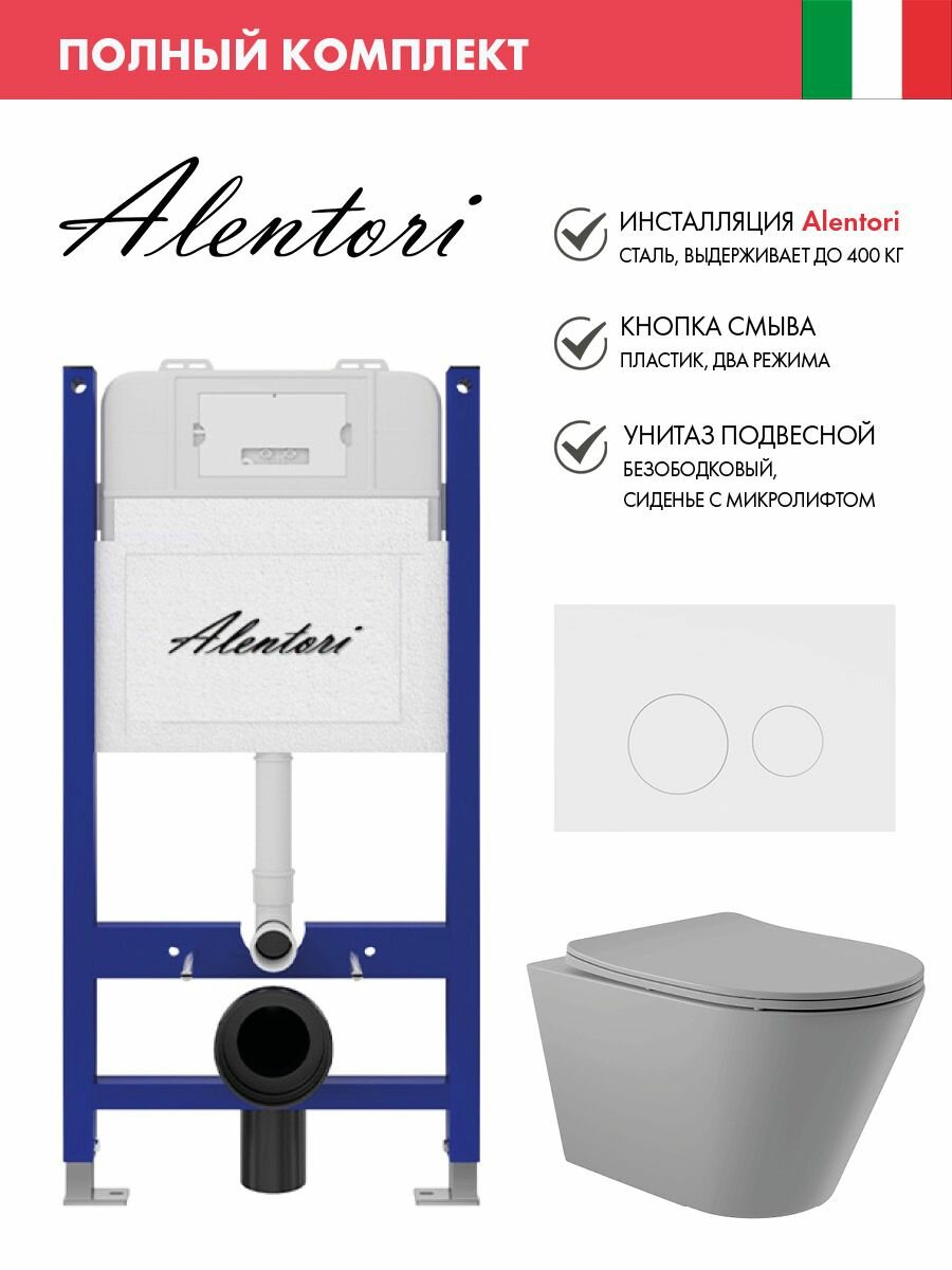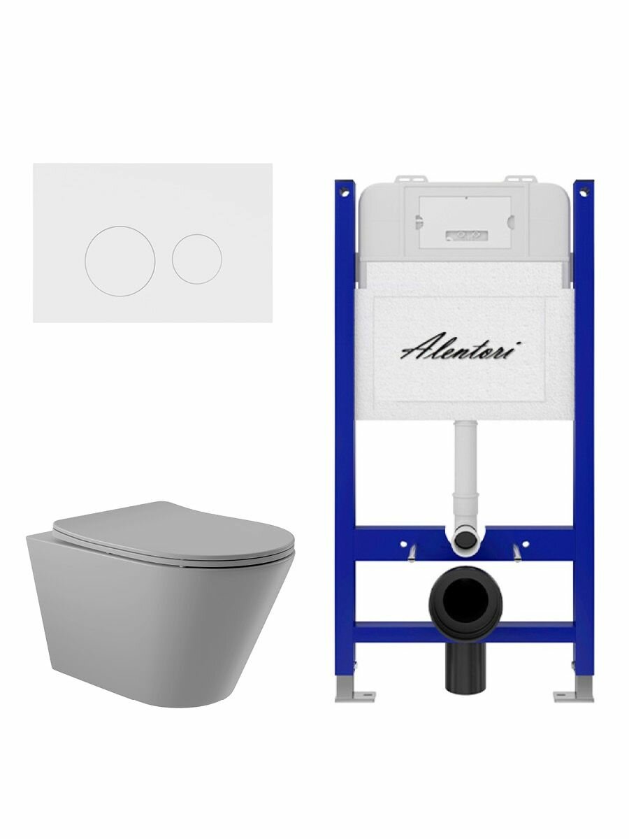 Купить Комплект Инсталляция для унитаза Alentori SISTEMA 50 AL. SIS33T с клавишей смыва Alentori CHIAVE L, белый матовый AL. CHI019WM + Унитаз 525*360 безободковый, Soft-Close, серый матовый, форма конус с доставкой по всей России.