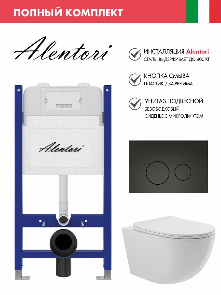 Купить Комплект Инсталляция для унитаза Alentori SISTEMA 50 AL. SIS33T с клавишей смыва Alentori CHIAVE L, черный матовый AL. CHI103BM + Унитаз 525*360 безободковый, Soft-Close, белый глянцевый, форма овал с доставкой по всей России.