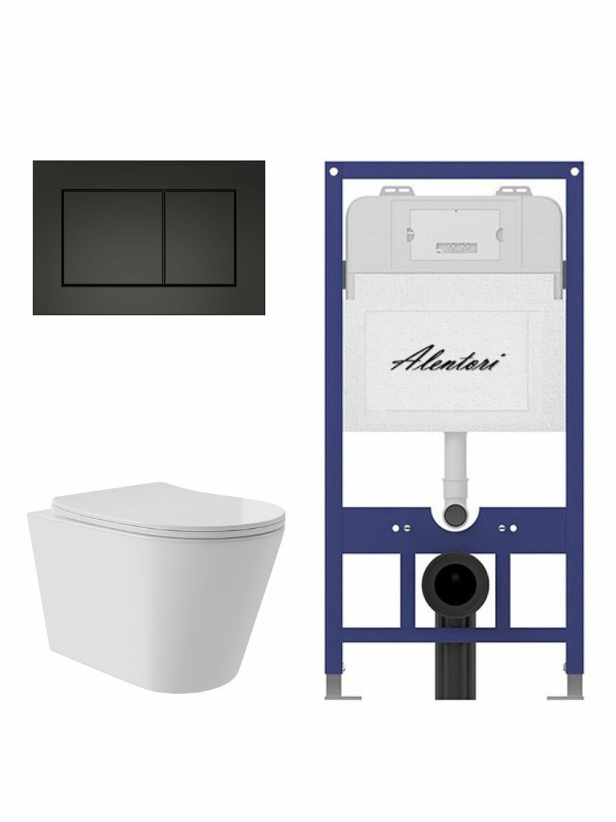 Купить Комплект Инсталляция для унитаза Alentori SISTEMA 52 AL. SIS11T с клавишей Alentori CHIAVE A, черный матовый AL. CHI013BM + Унитаз Long 520*365 безободковый, Vortex, Soft-Close, белый глянцевый, конус с доставкой по всей России.