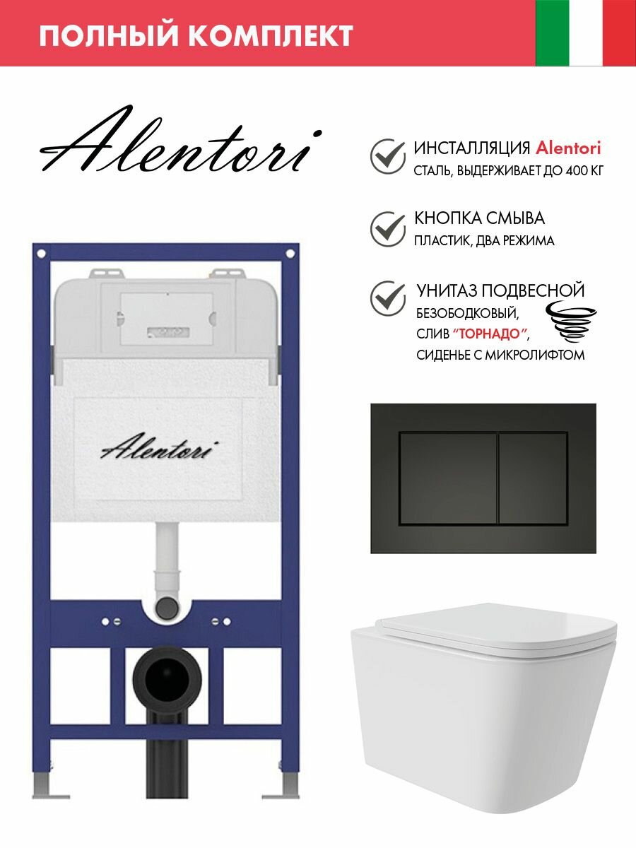 Купить Комплект Инсталляция для унитаза Alentori SISTEMA 52 AL. SIS11T с клавишей Alentori CHIAVE A, черный матовый AL. CHI013BM + Унитаз Long 525*345 безободковый, Vortex, Soft-Close, белый глянцевый, квадрат с доставкой по всей России.
