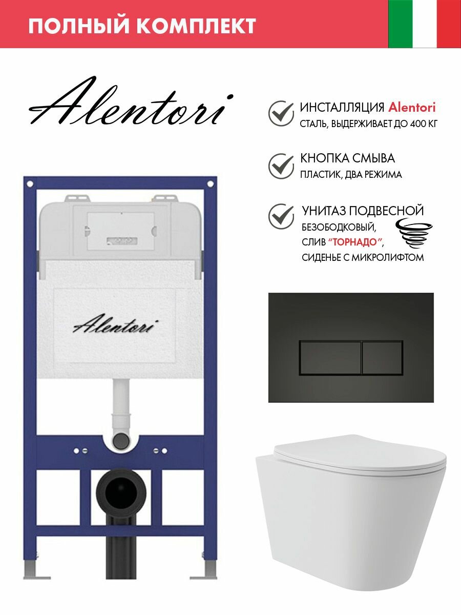 Купить Комплект Инсталляция для унитаза Alentori SISTEMA 52 AL. SIS11T с клавишей Alentori CHIAVE H, черный матовый AL. CHI203BM + Унитаз Long 520*365 безободковый, Vortex, Soft-Close, белый матовый, конус с доставкой по всей России.
