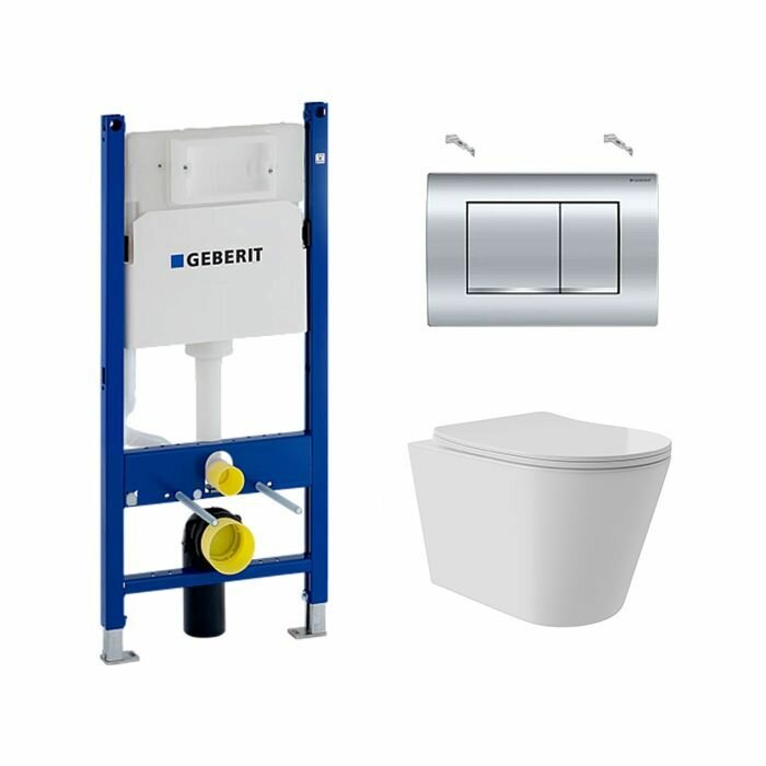 Купить Комплект Инсталляция Geberit Duofix, бачок Delta 12 см, клавиша Delta30, Хром 458.163.21.1 + Унитаз подвесной 520*365 безободковый Long, Vortex, сиденье Soft-Close, белый глянцевый, форма конус с доставкой по всей России.