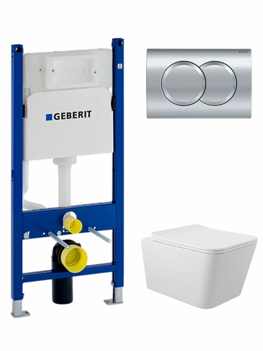 Купить Комплект Инсталляция Geberit Duofix с панелью смыва Delta01, Хром 458.149.21.1+Унитаз подвесной, безободковый, сиденье Soft-Close, белый глянцевый, форма квадрат с доставкой по всей России.