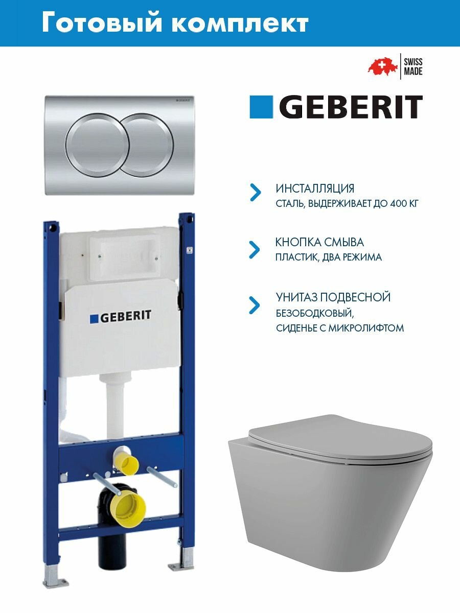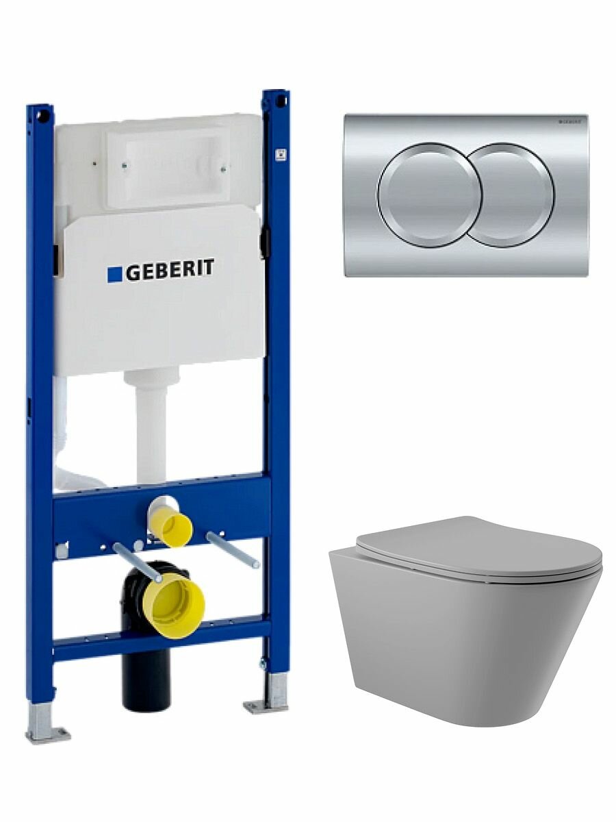 Купить Комплект Инсталляция Geberit Duofix с панелью смыва Delta01, Хром 458.149.21.1+Унитаз подвесной, безободковый, сиденье Soft-Close, серый матовый, форма конус с доставкой по всей России.