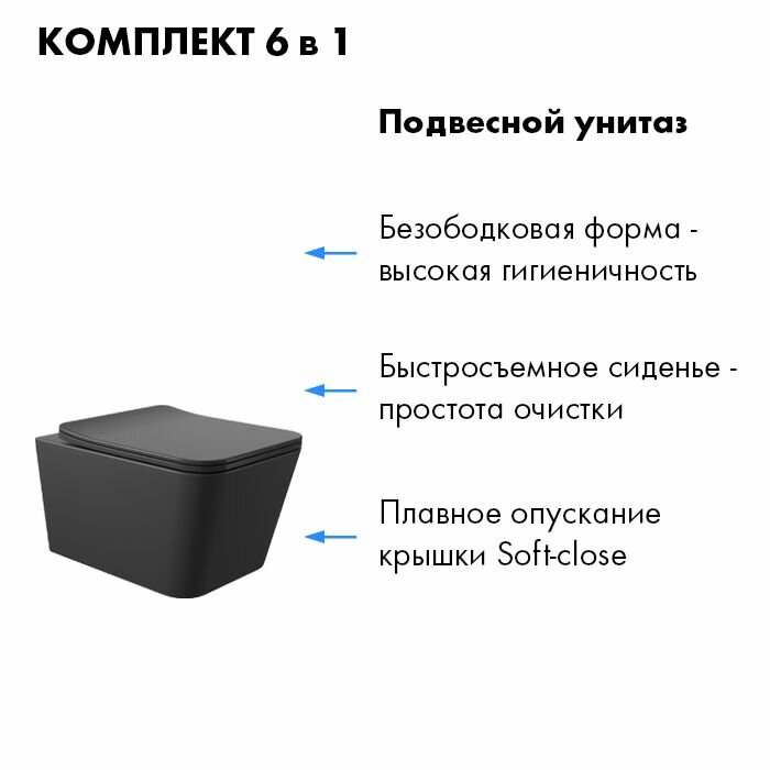 | Комплектация | бачок, инсталляция, монтажный набор креплений, панель смыва, сиденье |