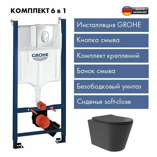 Комплект Инсталляция GROHE Rapid SL с панелью смыва, 3 режима, с панелью смыва, матовый хром + Унитаз подвесной 520*365 безободковый Long, Vortex, сиденье Soft-Close, черный матовый, форма конус: сравнение цен, характеристики, фото, актуальное наличие и цены.