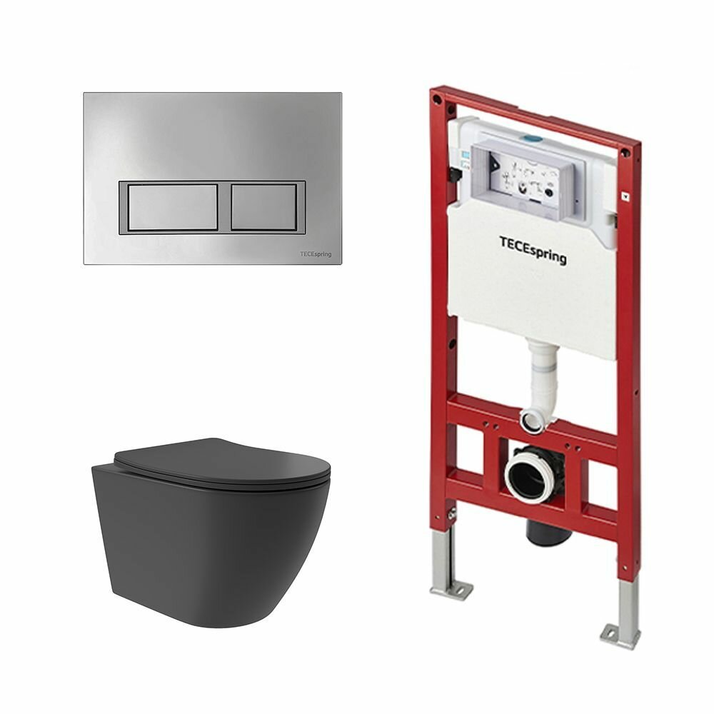 Комплект: Инсталляция TECE spring, панель смыва с прямоугольными кнопками, хром глянцевый + Унитаз подвесной 520*365 безободковый ADT Long, Vortex (Торнадо), Soft-Close, черный матовый, форма овал