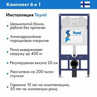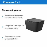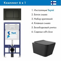 Комплект Инсталляция для подвесного унитаза Teymi Aina 52 T70011 с клавишей смыва Teymi Aina, двойной смыв, черный матовый T70013BM + Унитаз подвесной 520*370 безободковый, сиденье Soft-Close, черный матовый, форма квадрат Система инсталляции для унитазов Teymi Aina T70011: Крепится в капитальную стену и пол. Определяется механизмом системы инсталляции/скрытого бачка. Объем смывного бачка: 3 и 6 л. Подвод воды сверху / подвод воды сбоку. Диаметр слива: 6 см. Монтажная глубина: 10.8 см. Монтажная высота: 115.5 см. Межосевое расстояние под крепеж. шпильки: 18 / 23 см. Оснащение: смывной бачок Кнопка смыва Teymi Helmi T70013BM черный матовый. Габариты (ШхВ): 24.4x16 см. Известный финский бренд TEYMI, получивший признание покупателей на российском рынке. Клавиша скрывает удобное ревизионное окно, открывающее лёгкий доступ для обслуживания сливного бачка. Клавиша смыва имеет две кнопки и работает в режиме эконом / полный (объёмы смыва 3 литра / 6 литров); АБС-пластик. Унитаз ADT подвесной. Характеристики: Цвет: черный матовый. Материал: санфарфор. Габариты (ШхВхД): 370х290х520 мм. Антигрязевое покрытие. Антибактериальное покрытие. Устойчив к царапинам. Безободковая конструкция. Направление выпуска: горизонтальное (в стену). Смыв: прямой. Организация смывающего потока: каскадный. Система антивсплеск. Экономия воды. Монтаж : подвесной. Сиденье из дюропласта с плавным опусканием крышки (Микролифт), быстросъемное, ультратонкое.