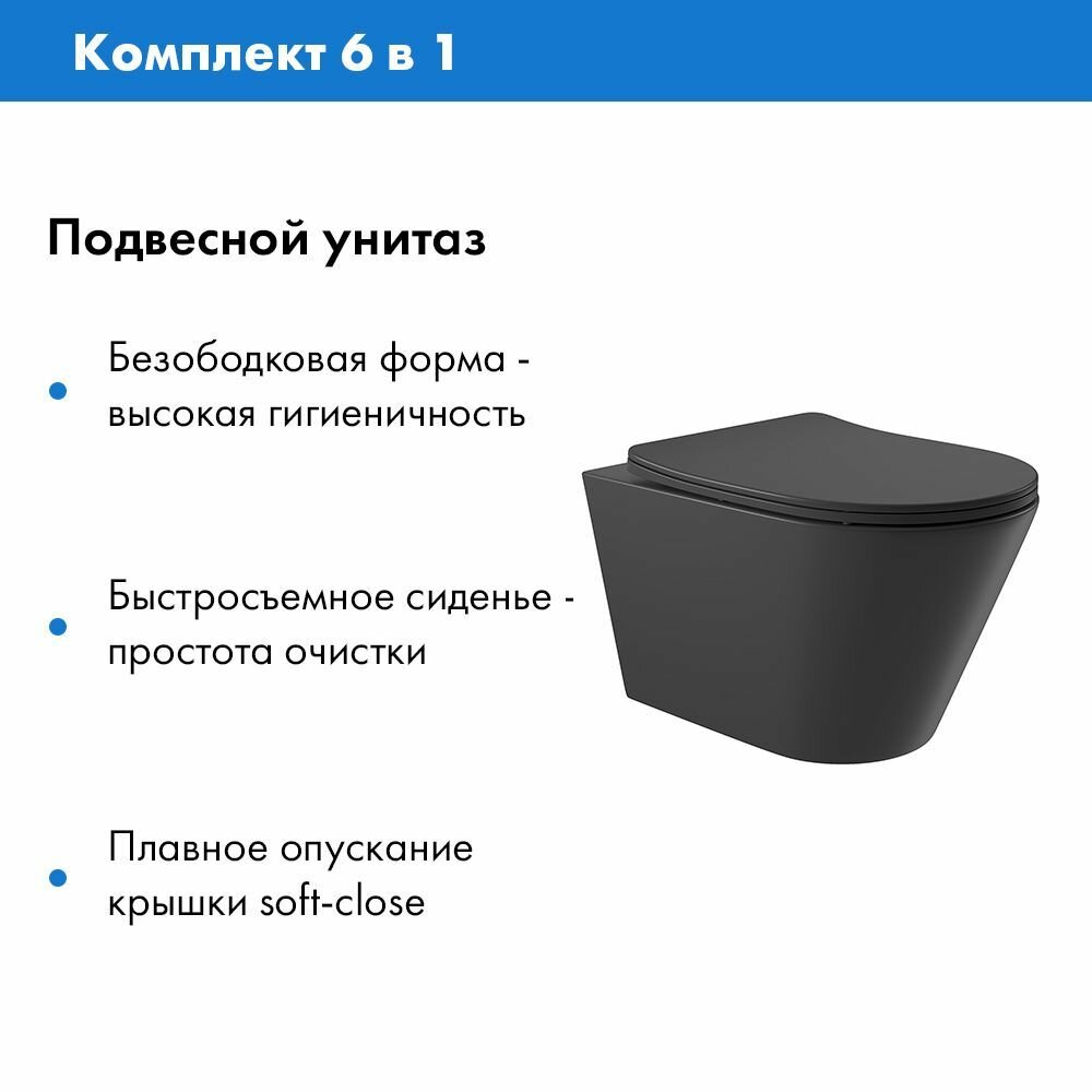 Купить Комплект Инсталляция Teymi Aina 52 T70033, клавиша Helmi, черный матовый T70203BM + Унитаз подвесной 525*360 безободковый, сиденье Soft-Close, черный матовый, форма конус с доставкой по всей России.